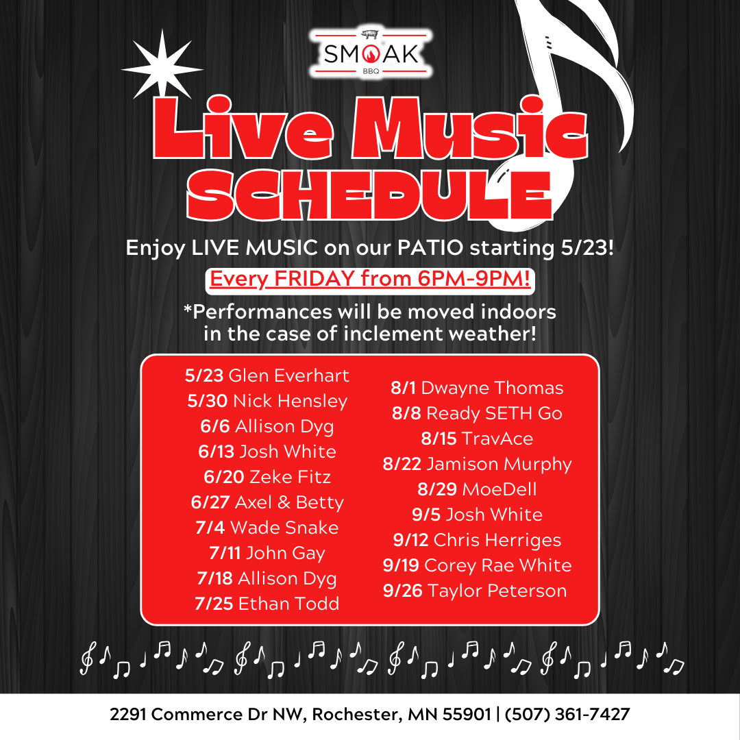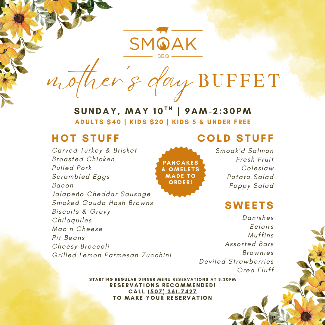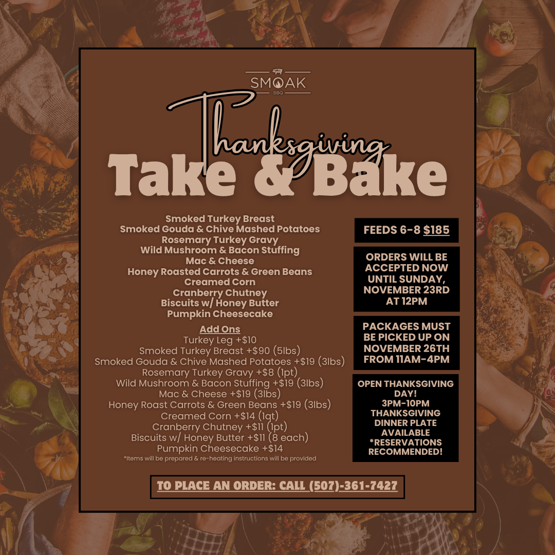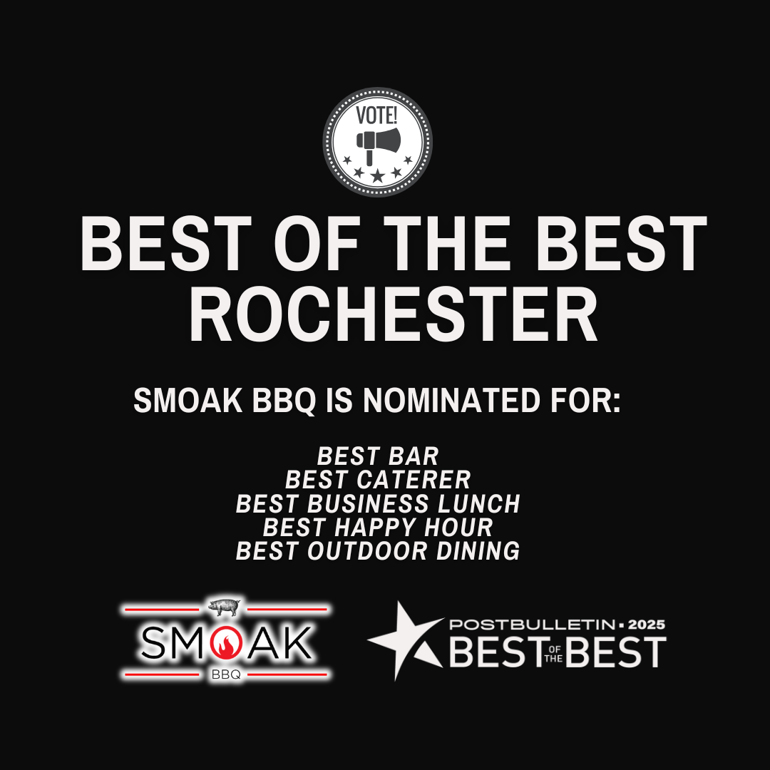 SMOAK has been a dream of ours for a few years. When we wanted to make it a reality, we decided to travel south to study our nation’s best BBQ. After spending many days in different states, learning the secrets of what makes BBQ great, we put our knowledge to the test. We spent hundreds of hours perfecting our smoked meats, rubs, and sauces, trying to bring the best BBQ to Rochester, MN that we could.
