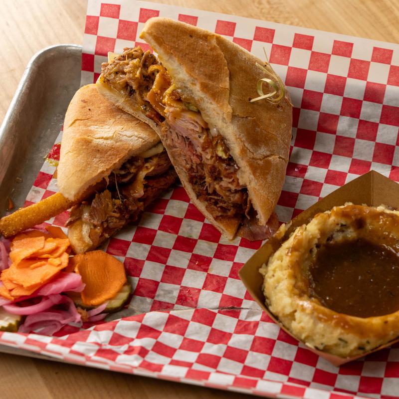 Pulled pork, shaved ham, swiss cheese, and pickle fries. Served on a pressed ciabatta bun with Carolina Mustard