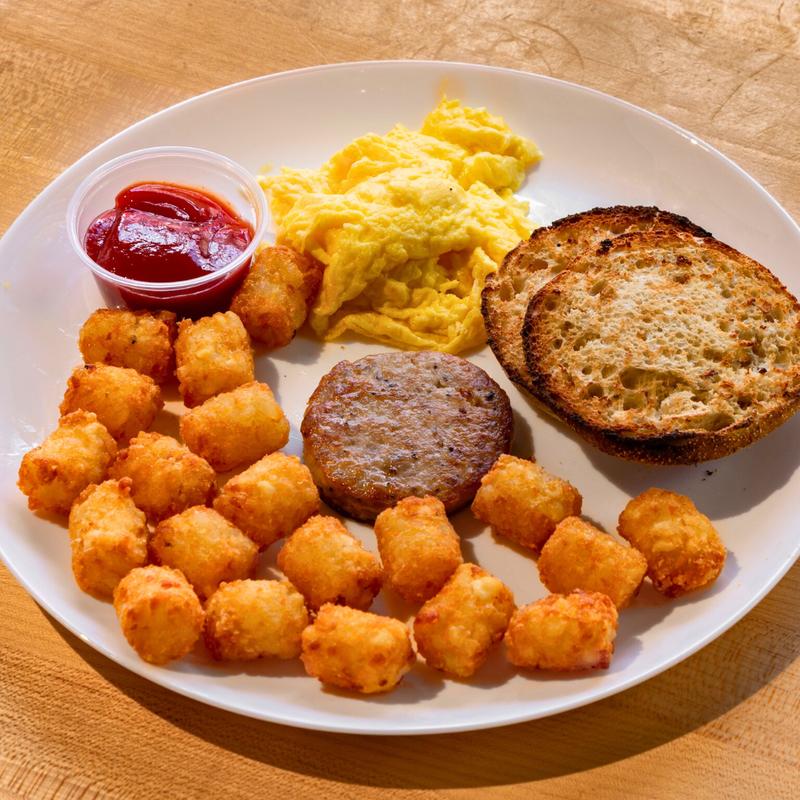 Eggs, choice of meat, tater tots, and choice of toast